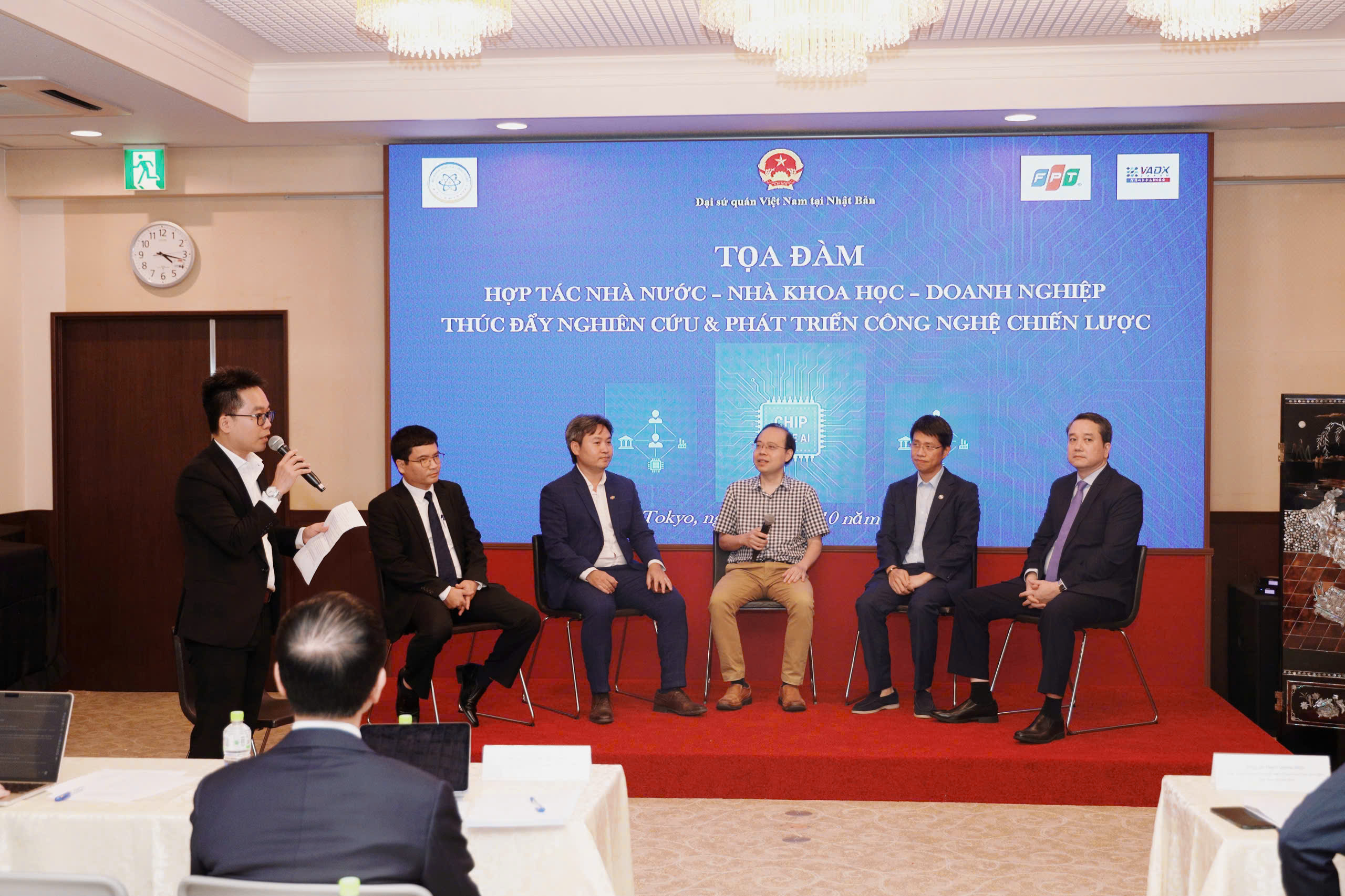 Ngày 2/10 vừa qua, tại trụ sở Đại sứ quán Việt Nam tại Nhật Bản đã diễn ra Tọa đàm với chủ đề “Hợp tác Nhà nước – nhà khoa học – doanh nghiệp: Thúc đẩy nghiên cứu phát triển công nghệ chiến lược – chip chuyên dụng”. Sự kiện có sự tham dự của Đoàn công tác Bộ Khoa học và Công nghệ do Ủy viên Trung ương Đảng, Bộ trưởng Nguyễn Mạnh Hùng dẫn đầu, cùng các chuyên gia, trí thức Việt Nam và cộng đồng doanh nghiệp đang hoạt động tại Nhật Bản. Tọa đàm được đồng tổ chức bởi Đại sứ quán Việt Nam tại Nhật Bản, Tập đoàn FPT và Hiệp hội Chuyển đổi số Việt Nam tại Nhật Bản (VADX).