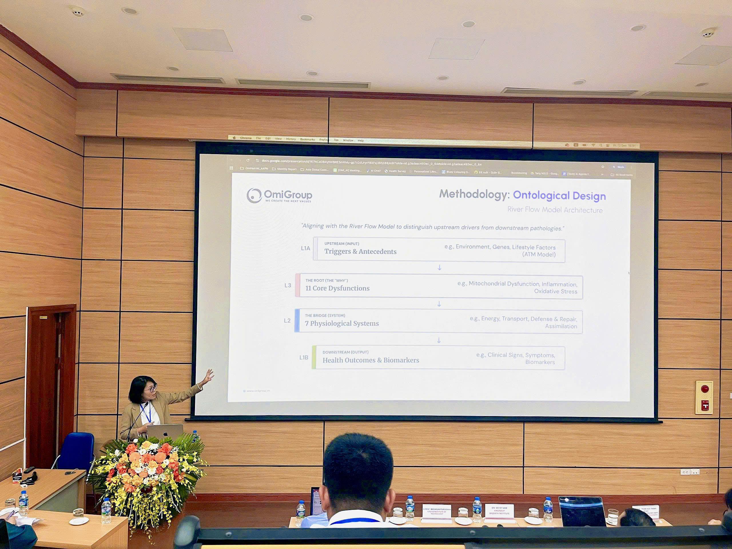 Tại phiên thảo luận Chuyển đổi số và AI trong y tế, chị Nguyễn Thị Trang Nhung – Trưởng nhóm nghiên cứu AI OmiGroup đã trình bày báo cáo khoa học với chủ đề “Phân tích Nguyên nhân Gốc rễ dựa trên Đồ thị Tri thức trong Y học Chức năng”. Bài trình bày giới thiệu OmiKG (Omi Knowledge Graph) – nền tảng đồ thị tri thức hỗ trợ phân tích nguyên nhân gốc rễ của bệnh lý mạn tính, hướng tới chuyển dịch từ điều trị triệu chứng sang giải quyết căn nguyên bệnh.